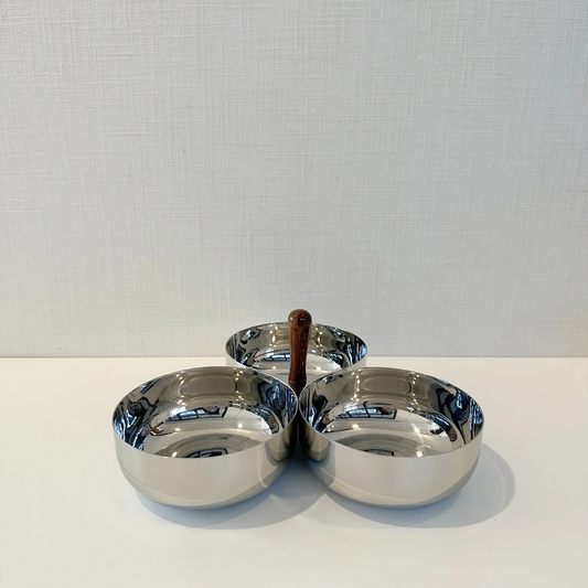 Kalman Polished Stainless Steel and Walnut Wood Serving Bowl Trio
